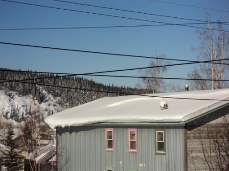 | The shoes that have been covered in snow and hanging on the telephone line since we arrived. |